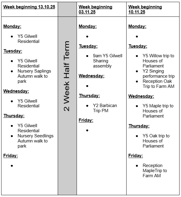 Keep a look-out for an email next week (week beginning 13.10.25) to book your time for parent-teacher meetings. School will close at 1pm with parent-teacher meetings starting at 1.30pm.